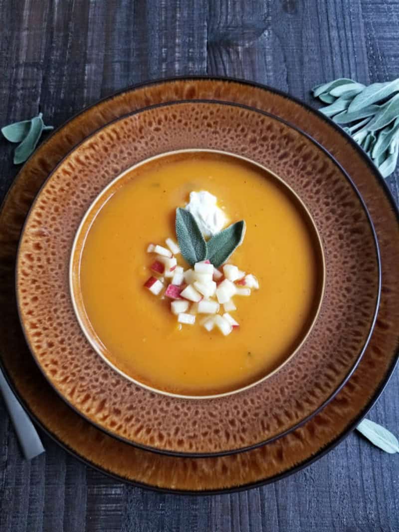 This Creamy Butternut Squash Soup is velvety, lightly sweet and topped with crisp apple. It is a delicious vegetarian meal. And, it is perfect during the fall and winter months.